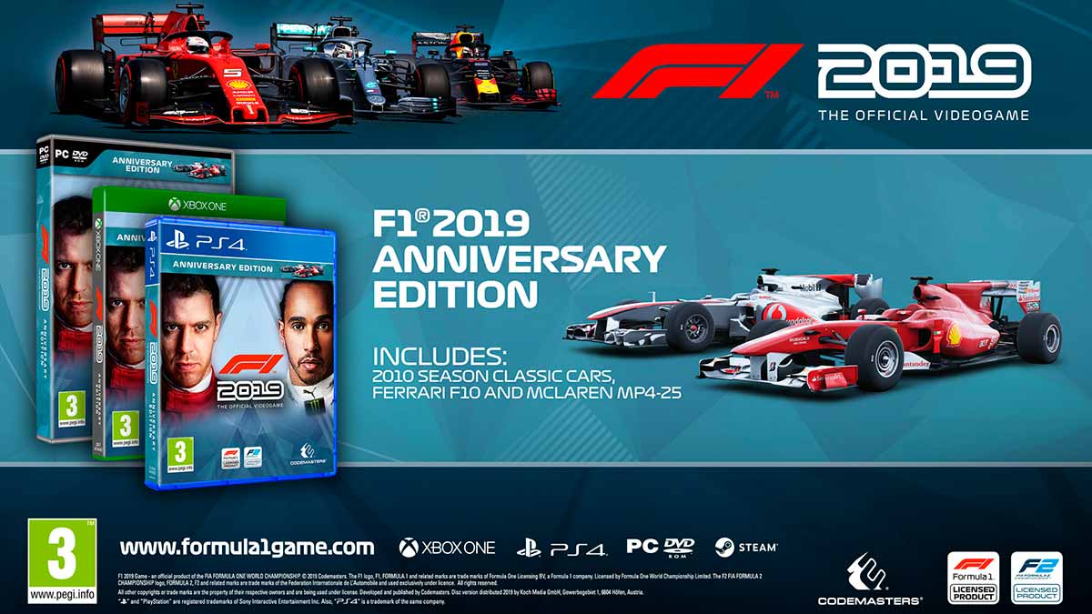 F1 2019 ANNIVERSARY EDITION — Ф1 2019 включает все оффициальные команды, всех оффициальных гонщиков и все 21 трассы из 2019 сезона Формулы 1. В этом году в игре появится нововведение - карьерный режим Ф2, в котором игроки смогут закончить 2018 сезон плечом к плечу с Джорджем Расселом, Ландо Норрисом и Александром Албоном. Разработчики удилили дополнительное внимание графической составляющей игры, благодаря чему трасы стали как никогда более детализированными. Ночные заезды были полностью переработаны для поднятия реалистичности заездов. Также игроков ждет обновленная озвучка коментаторов, для еще больше погружения в игру.